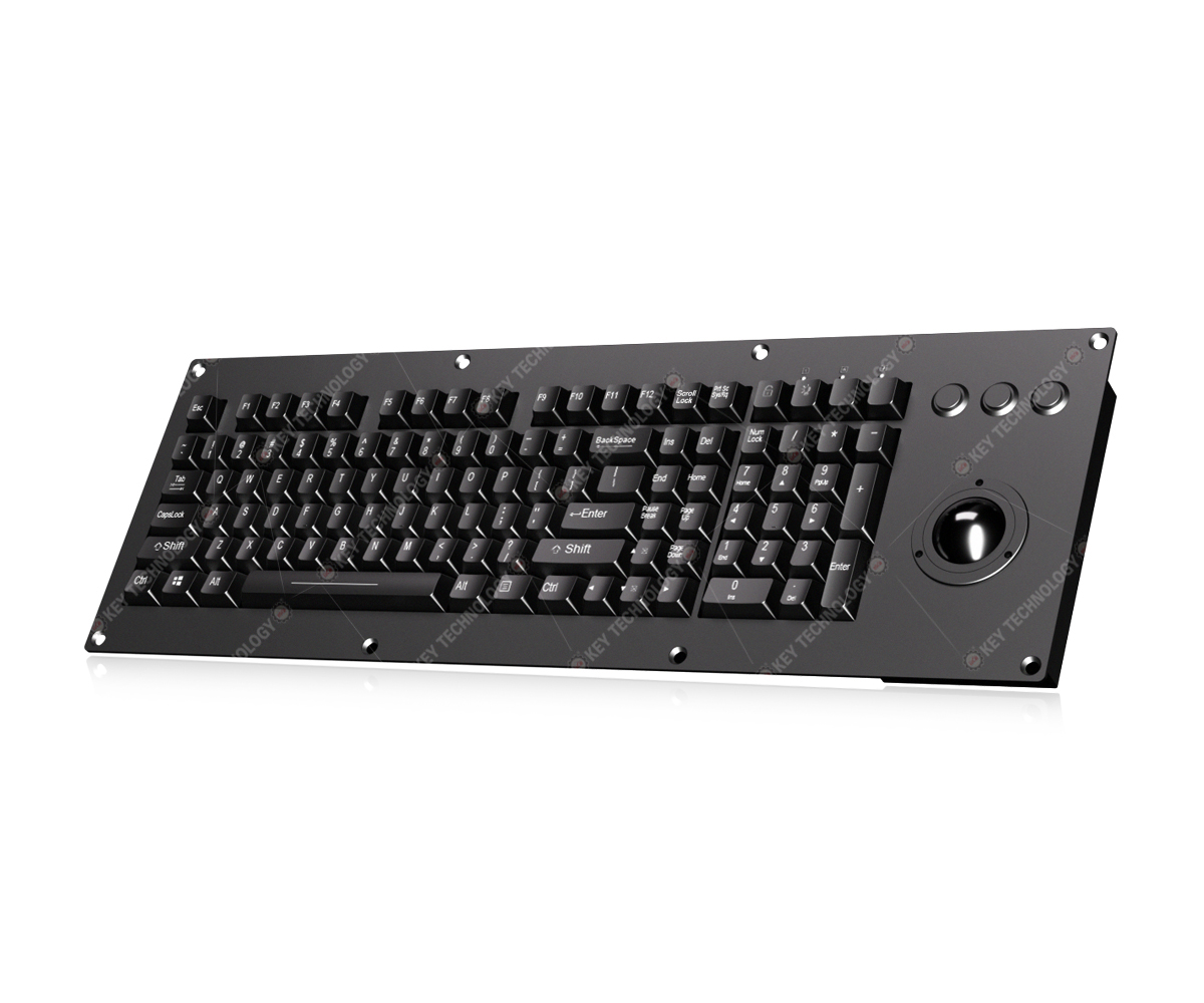 DESCRIPTION: 107 keys IP54 rated rugged durable embedded military mechanical keyboard, with built-in wide temperature military grade electronics controller module, with numeric keypad, 12 FN keys (F1, F2...F11, F12) are on top line for easy operation, as well as 38mm removable and anti-vibration black hardened resin mechanical ball module with 400DPI resolutions for fast and accurate cursor position, 3 mouse buttons on the top of trackball. Rugged stainless steel black titanium electroplated front plate, PC material button, with mechanical axis key switch and 4.00mm long stroke with extremely good tactile feeling for fast and accurate data input, with durable coating & antimicrobial surface to withstand bacteria and work well under harsh environment, top panel mounted solution with sinking holes, with green backlight included and USB interface. Designed to meet MIL-STD-461G (EMC, EMI, EMS, ESD), MIL-STD-901D as well as MIL-STD-810H (high and low wide temperature, low pressure, humidity, vibration, shock, salt spray, temperature shock, drop, rain, dust, fungus, solar radiation etc.), which can also meet the critical military standards in these 10 aspects: reliability, safety, maintainability, testability, supportability, environmental adaptability, stability, compatibility, consistency, and continuity. DIMENSION: 503.0*170.8*34.0mm (L x W x H)