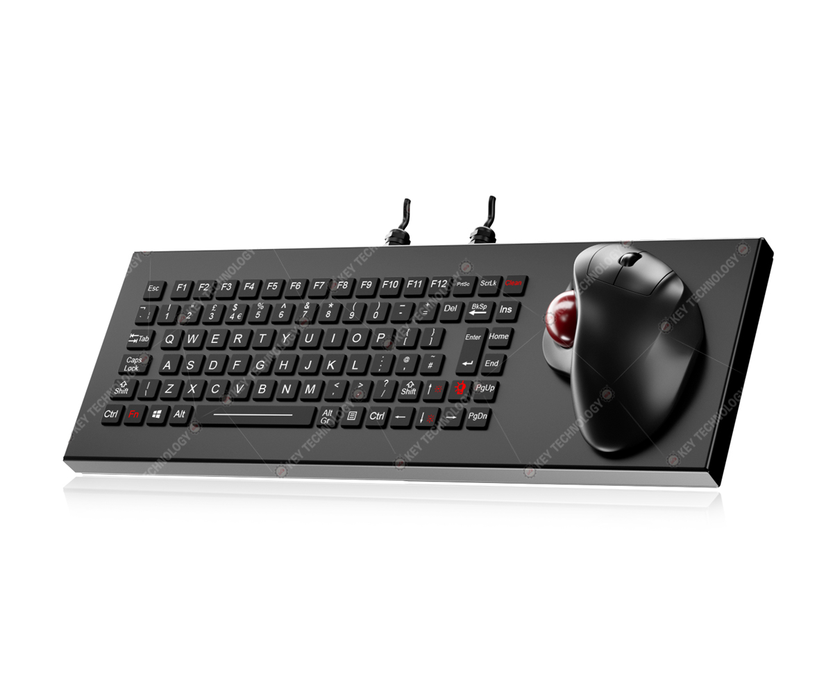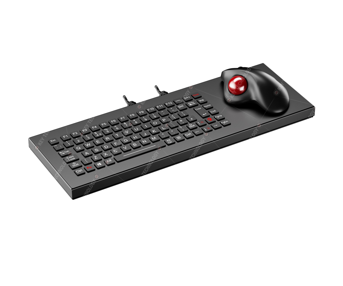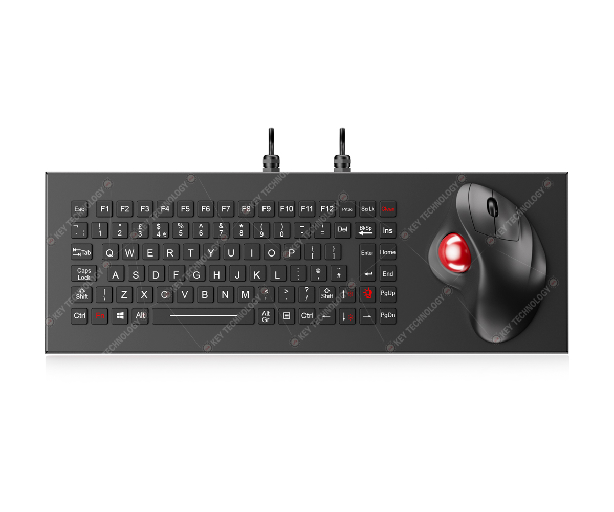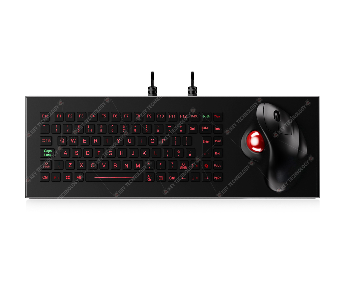 DESCRIPTION: 89 keys IP68 dynamic water proof vandal proof stainless steel military chiclet keyboard with durable polymer keys,with 12 function keys F1, F2,...F12 on the top line, integrated with IPX6 rated ergonomic 34mm optical trackball module with 500~1000 DPI resolutions for fast and accurate fixing cursor position with extreme smooth operation without any noise, with 3 mouse buttons for left/right clicking, as well as middle wheel for scrolling function. Ruggedized military grade PCB with carbon-on-gold key switch technology with stroke(1.20mm±0.10mm) with extremely good tactile feeling for fast and accurate data input without any noise, high quality durable black titanium electroplate on the whole keyboard housing, one complete silicone rubber along stainless steel plate for easily mounting and sealing tightly with cabinet , FN + Clean combination keys for easily cleaning without taking the keyboard away from PC. Movable stand alone DESK TOP VERSION. Adjustable red backlight included. Dual USB interface, which meets IEC60945-2002, designed to meet MIL-STD-461G (EMC, EMI, EMS, ESD) and MIL-STD-810H(high and low wide temperature, low pressure, humidity, vibration, shock, temperature shock, rain, dust, salt mist, fungus, solar radiation etc.), as well as the critical military standards in these 10 aspects: reliability, safety, maintainability, testability, supportability, environmental adaptability, stability, compatibility, consistency, and continuity. Dimension: 440.0mm x 153.0mmx26.0mm(LXWXH)