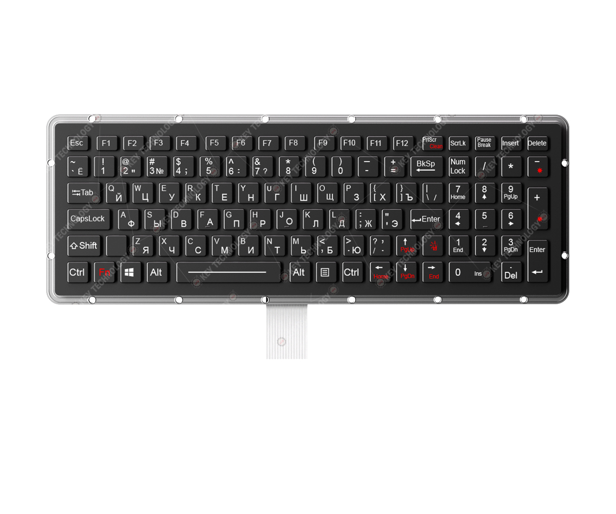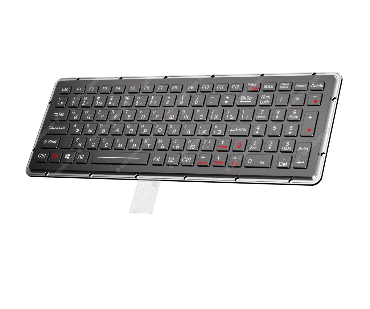 Description Download DESCRIPTION: 101 keys IP65 dynamic water proof vandal proof rugged chiclet keyboard with durable polymer keys, with ultra-thin military grade dot matrix PCB and semi-reinforced ultra-thin rugged aluminum alloy back plate. With 12 function keys F1, F2, ... F12 on the top of keyboard and individual numeric keypad on the right side of keyboard for easy operation. The whole keyboard is made of CNC aluminum alloy front plate + PC keycaps with carbon-on-gold key switch technology+military grade dot matrix PCB.With 1.20mm±0.10mm key travel with extremely good tactile feeling for fast and accurate data input without any noise,with durable coating & anti-microbial keyboard surface withstand to most chemicals and liquids under harsh environment, rear panel mounted with mounting holes, adjustable white backlight included. FN + Clean combination keys for easy cleaning without taking the keyboard away from PC, and avoid mis-operation or mistyping. Designed to meets MIL-STD-810H (high and low wide temperature, low pressure, humidity, vibration, shock, salt spray, temperature shock, rain, dust, fungus, solar radiation etc.), and MIL-STD-461G-EMC-EMI-EMS-ESD (optional), as well as military standards: reliability, safety, maintainability, testability, supportability, environmental adaptability, stability, compatibility, consistency, and continuity. Dimensions: 327.0mm x 111.0mm (Front Panel)
