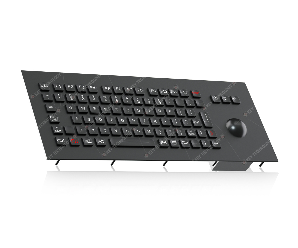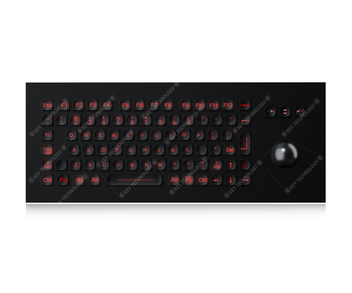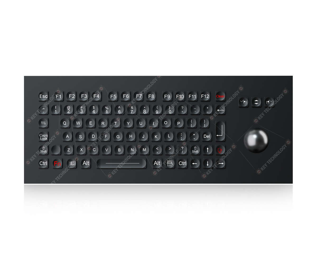 DESCRIPTION: 85 keys (Including 3 mouse buttons) IP65 dynamic water proof vandal proof stainless steel military keyboard with durable polymer keys. With IP65 static 38.0mm black harden resin mechanical trackball module(stainless steel trackball is optional) in 400 DPI resolutions for fast and accurate cursor movement. Rugged military PCB with carbon-on-gold key switch technology with long stroke (1.50mm±0.10mm) with extremely good tactile feeling for fast and accurate data input without any noise, functional keys F1, F2, F3...F10, F11, F12 are on the top line for easy operation. High quality durable black titanium electroplated on the top of stainless steel plate, 3 mouse buttons designed for right & left clicking, strong durable polymer keys caps with laser technology for backlight out, with adjustable backlight(Red or Blue) included, stainless steel top plate with sealing gasket and threaded bolts for top panel mounting solution. FN + CLEAN key to lock/disable the keyboard for easy cleaning without taking away the keyboard from PC, which is good for outdoor application with direct rain and very harsh environments with humidity, much dynamic water, oil, dirt, salt mist etc, direct drain pipe is optional, no rust risk and anti-salt spray corrosion. Aviation plug with USB interface. Designed to meet MIL-STD-461G (EMC, EMI, EMS, ESD) and MIL-STD-810H (high and low wide temperature, low pressure, humidity, vibration, shock, temperature shock, rain, dust, salt mist, fungus, solar radiation etc.), as well as the critical military standards in these 10 aspects: reliability, safety, maintainability, testability, supportability, environmental adaptability, stability, compatibility, consistency, and continuity. DIMENSIONS: 361.0mm x 145.0mm (front panel)
