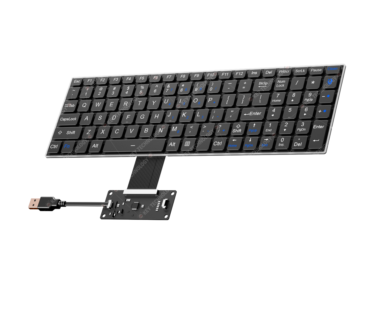 DESCRIPTION: 103 keys IP67 fully dynamic sealed waterproof and durable embedded ultra thin rugged patented scissor switch keyboard, with built-in ultra-thin Flexible Printed Circuit, 12 function keys (F1, F2, ... F12) are on top line for easy operation, and numeric keypad on right side. It adopts scissor switch technology with 1.20mm±0.10mm key travel with extremely good tactile feeling for fast and accurate data input without any noise, there will be no key value missing, no stuck key or repeat output during the keyboard operation, with durable coating & anti-microbial keyboard surface withstand most chemicals and liquids under harsh environment. FN + Clean combination keys for easy cleaning without taking the keyboard away from PC to avoid mis-operation or mis-typing. Adjustable white backlight (Red/Green/Yellow optional) included, panel mount solution. Designed to meet MIL-STD-810F (high and low wide temperature, low pressure, humidity, vibration, shock, temperature shock, rain, salt mist, dust, fungus, solar radiation etc.) as well as the critical military standards in these 10 aspects: reliability, safety, maintainability, testability, supportability, environmental adaptability, stability, compatibility, consistency, and continuity; MIL-STD-461G-EMC-EMI-EMS-ESD (optional). Patented keyboard (Patent number: 202422198937.6) Dimensions: 340.0mm x 108.0mm (Maximum frame size)