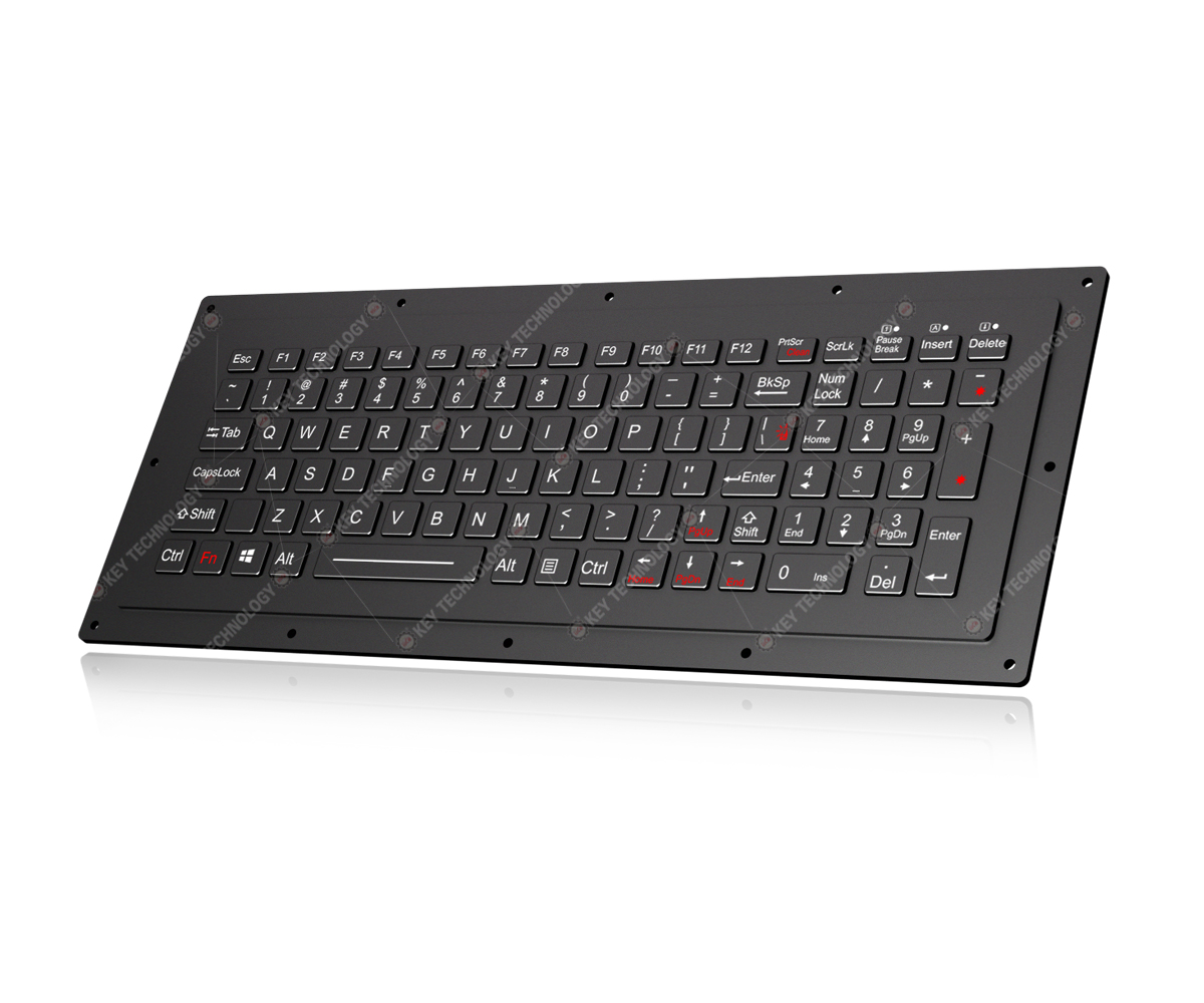 DESCRIPTION: 101 keys IP65 dynamic water proof vandal proof rugged military chiclet keyboard with durable polymer keys. Integrated stepped aluminum alloy panel is processed by CNC. An additional black silicon gasket goes along with the top panel for easy mounting & sealing with cabinet. 12 function keys F1, F2, ... F12 are on top line of keyboard and numerical keypad at the right side of keyboard. Military grade PCB with carbon-on-gold key switch technology with key stroke (1.20mm±0.10mm) with extremely good tactile feeling for fast and accurate data input without any noise. It is made of CNC aluminum alloy front plate + PC keycaps + military grade PCB, High quality durable black titanium spray-paint on the aluminum alloy panel, Rear panel with mounting hole for rear panel mounting. Adjustable white backlight included. FN + Clean combination keys for easy cleaning without taking the keyboard away from PC, and prevent misoperation or typo. Designed to meet MIL-STD-461G (EMC, EMI, EMS, ESD) and MIL-STD-810H (high and low wide temperature, low pressure, humidity, vibration, shock, temperature shock, rain, dust, salt mist, fungus, solar radiation etc.), which is good for outdoor application with direct rain and harsh environments with humidity, much dynamic water, oil, salt mist etc. Dimensions: 338.0mm x 122.0mm (front panel)