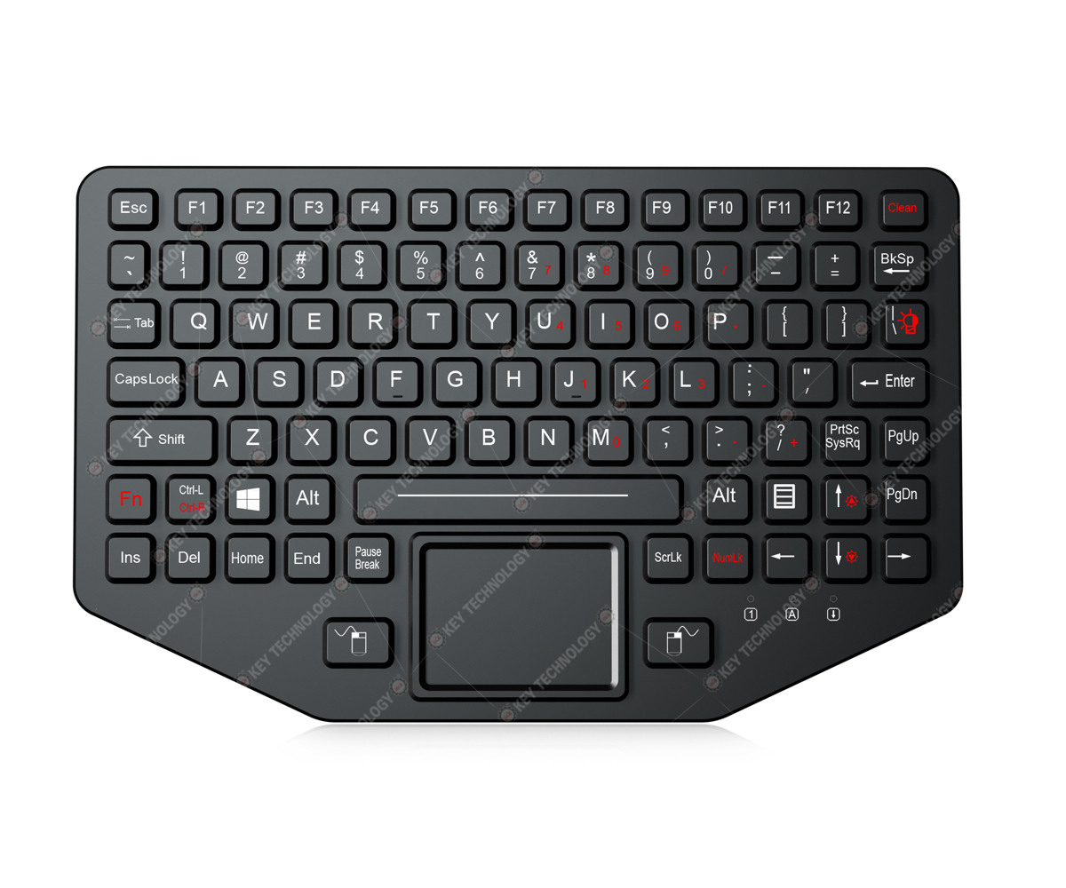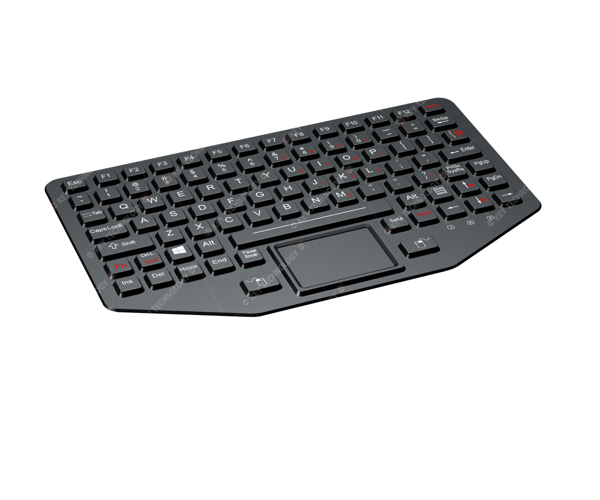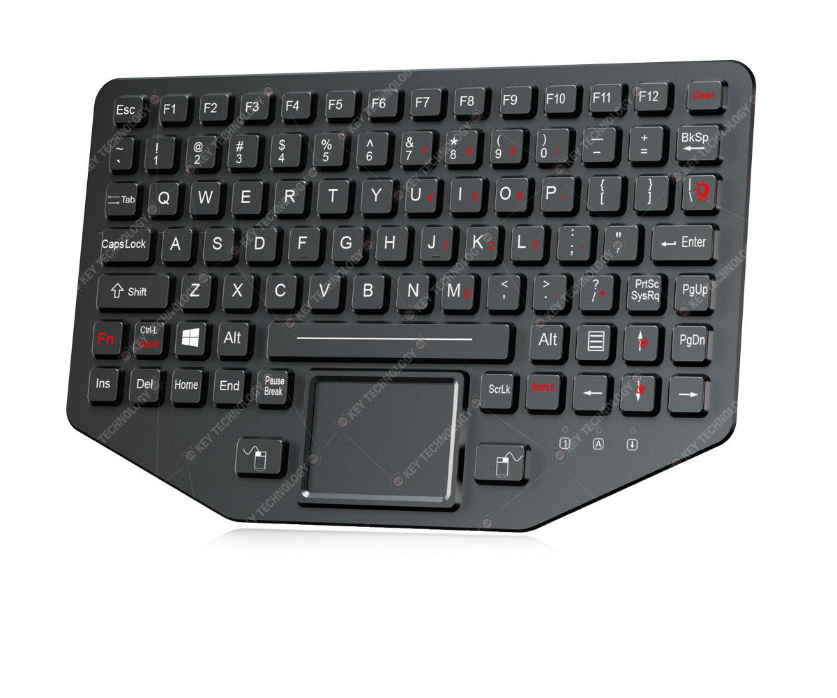 DESCRIPTION: 89 keys IP65 dynamic sealed and ruggedized silicone rubber military keyboard with sealed and tough touch pad for fast and accurate cursor position, 12 FN keys (F1, F2...F11, F12) are on top line for easy operation, the overall key layout is compact, with military PCB with carbon-on-gold key switch technology with long stroke (1.50mm) with extremely good tactile feeling for fast and accurate data input without any noise, with durable coating & antimicrobial keyboard surface withstand to most chemicals and liquids under harsh environment, top panel mounting, with adjustable backlight included. FN+CLEAN combination key to lock/disable the whole keyboard for easy cleaning without disconnecting the keyboard from computer, sealed and ruggedized with top rubber for top panel mounting. With exposed copper treatment surrounding the edges of backside PCB and designed without silicone rubber around the PCB edges for optimizing the sealing with cabinet and preventing electromagnetic leakage from the device.Meet the military requirements of strong anti-interference, stability, and low radiation etc. Designed to meet MIL-STD-461G (EMC, EMI, EMS, ESD) and MIL-STD-810H (high and low wide temperature, low pressure, humidity, vibration, shock, temperature shock, rain, dust, salt mist, fungus, solar radiation etc.), as well as the critical military standards in these 10 aspects: reliability, safety, maintainability, testability, supportability, environmental adaptability, stability, compatibility, consistency, and continuity. DIMENSION: 283.0mm x 177.7mm (L x W)
