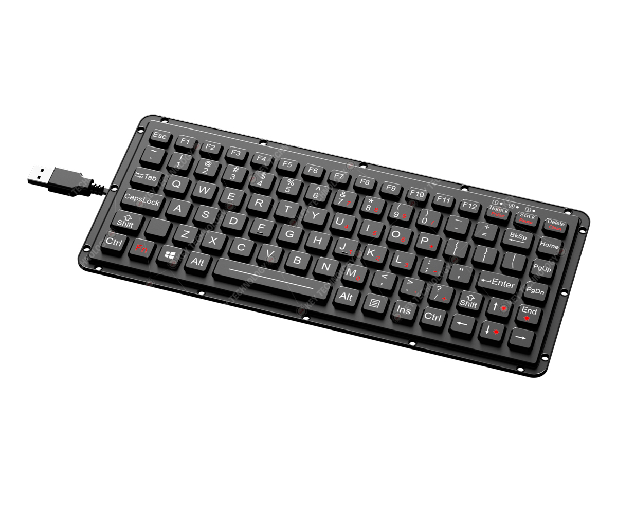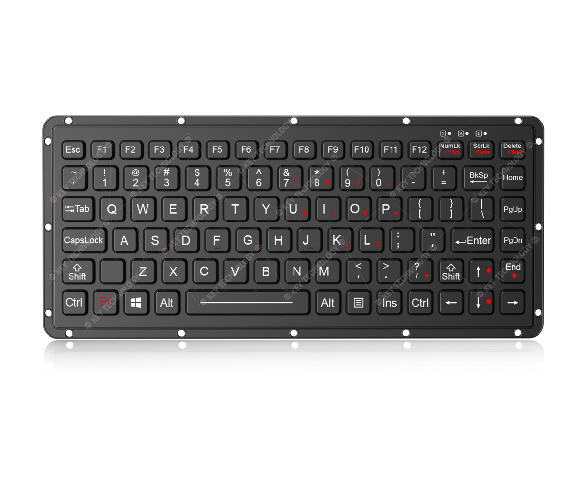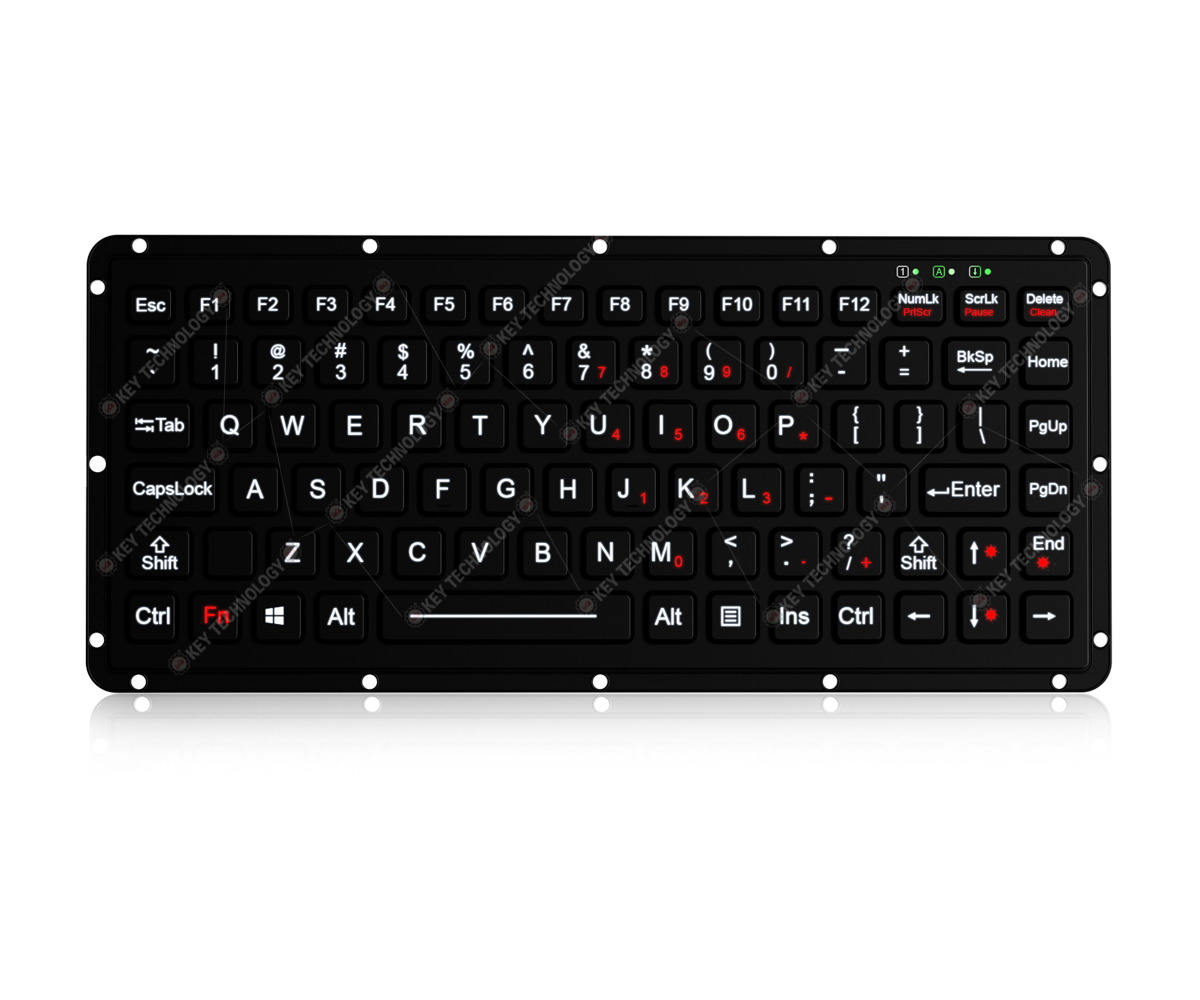 DESCRIPTION: 87 keys IP65 dynamic sealed and durable embedded silicone rubber rugged keyboard, with built-in military grade PCB,12 function keys on top line for easy operation, with carbon-on-gold key switch technology with key stroke (1.50±0.10mm) with extremely good tactile feeling for fast and accurate data input without any noise, with durable coating & anti-microbial keyboard surface withstand to most chemicals and liquids under harsh environment, FN + Clean combination key for easy cleaning via lock/disable whole keyboard without needing to take away the keyboard from PC, rear panel mounted, with a reinforced and rugged aluminum back plate for better shielding function and positioning of the rugged cable outlet, adjustable whitebacklight included. Designed to meet MIL-STD-461G (EMC, EMI, EMS, ESD) and MIL-STD-810H (high and low wide temperature, low pressure,humidity, vibration, shock, temperature shock, rain, dust, salt mist, fungus, solar radiation etc.), as well as the critical military standards in these 10 aspects: reliability, safety, maintainability, testability, supportability, environmental adaptability, stability, compatibility, consistency, and continuity. DIMENSIONS: 270.0mm x 113.0mm (front panel)