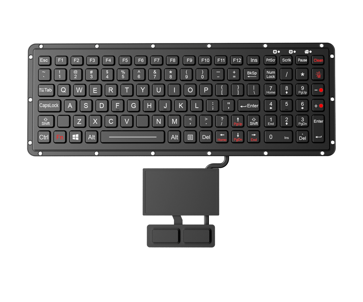 DESCRIPTION: 102 keys IP65 dynamic sealed & ruggedized silicone rubber military keyboard with sealed tough touchpad with 400DPI resolutions for fast cursor position, with numeric keypad on the right side of keyboard and 12 function keys on top line for easy operation, with carbon-on-gold key switch technology with key stroke (1.50mm) with extremely good tactile feeling for fast and accurate data input without any noise, with durable coating & anti-microbial keyboard surface withstand to most chemicals and liquids under harsh environment, FN + Clean combination key for easy cleaning via lock/disable whole keyboard without needing to take away the keyboard from PC, panel mount with super thin ruggedized aluminum back plate with mounting holes, adjustable white backlight included. Embedded installation mode. Designed to meet MIL-STD-461G (EMC, EMI, EMS, ESD) and MIL-STD-810H (high and low wide temperature, low pressure, humidity, vibration, shock, temperature shock, rain, dust, salt mist, fungus, solar radiation etc.), as well as the critical military standards in these 10 aspects: reliability, safety, maintainability, testability, supportability, environmental adaptability, stability, compatibility, consistency, and continuity.